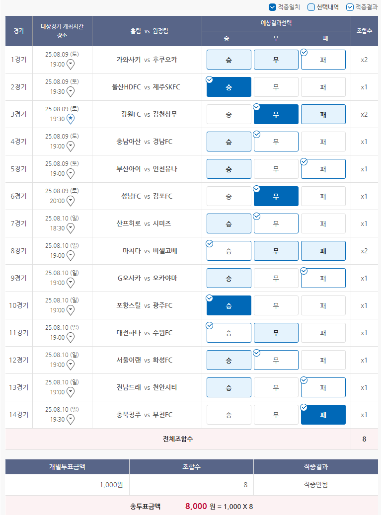 | ⑧ | J1 | 마치다 vs 고베 | 2.65 / 2.95 / 2.31 | 고베 승 | 마치다 승 (2:0) | ❌ |