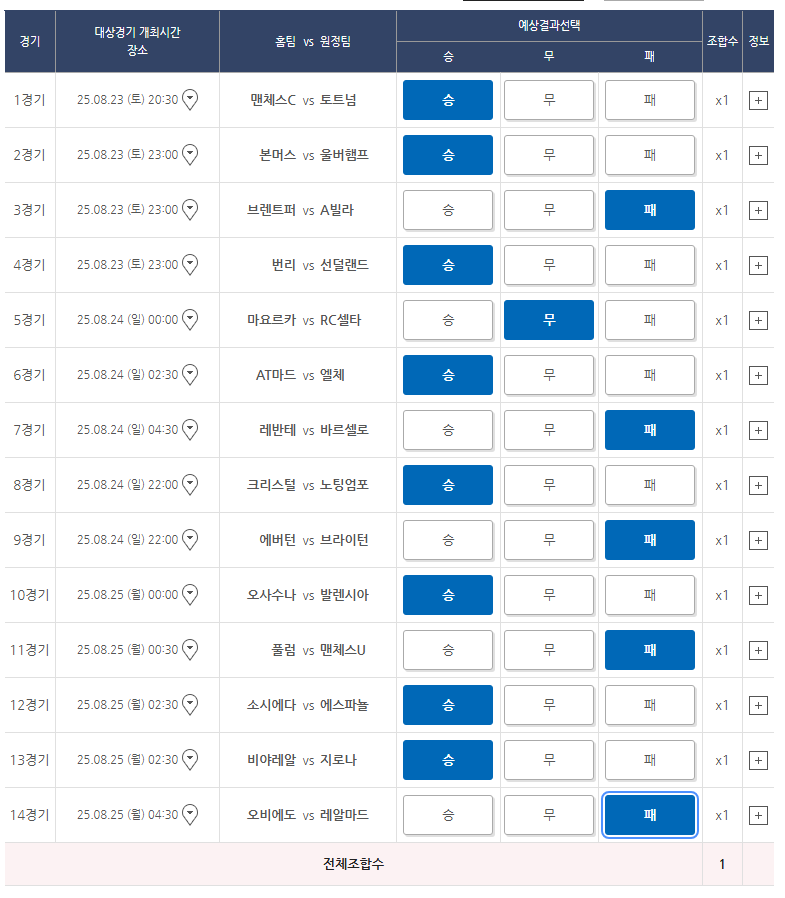 | 번호 | 리그 | 대진 | 배당 (승/무/패) | 예측 | 복수선택 추천 |