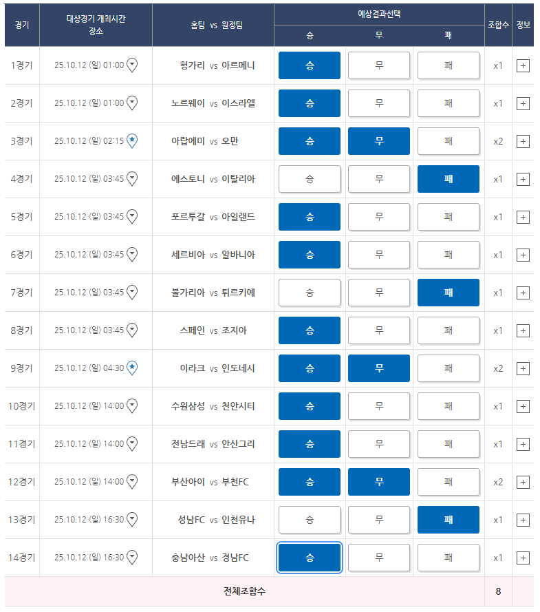 | ⑬ | 성남FC vs 인천유나이티드 | 3.25 / 3.10 / 1.88 | 인천유나이티드 승 | |