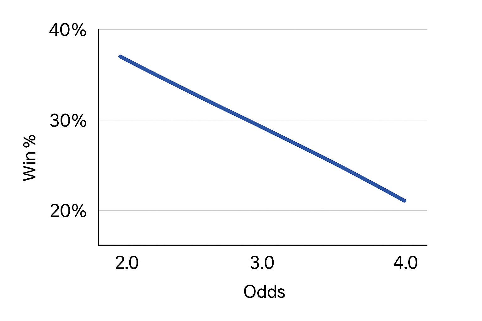 아래 그래프는 배당 구간(2.0~4.0)과 실제 언더독 승률(%) 변화를 시각적으로 표현했습니다.