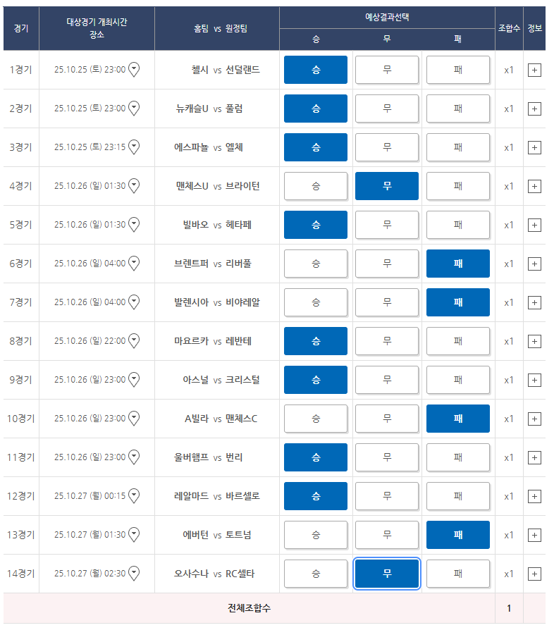 특히 ‘승’ 픽이 많은 구조로, 전통적인 강팀 중심의 결과가 나올 가능성이 높습니다.