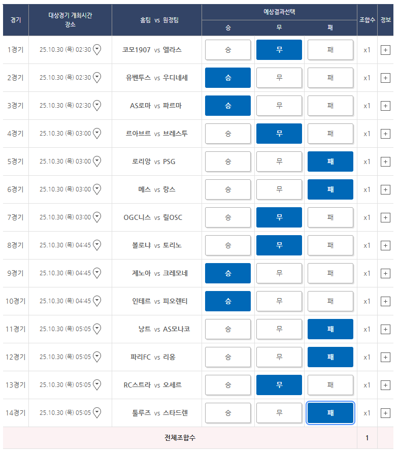 ⚽ [축구토토 승무패 71회차 예측] 세리에A·리그앙 통합 분석 (10월 30일 경기)