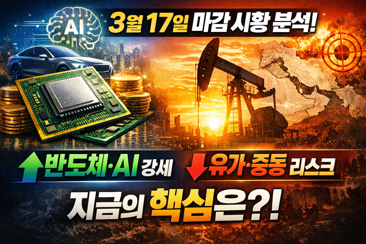 3월 17일 국내 증시는 반도체·자동차 중심의 상승 흐름을 보였지만, 장 후반 유가 급등과 중동 리스크 재부각으로 상승폭이 축소되며 지수보다 업종 선택이 중요한 장세가 이어졌다.